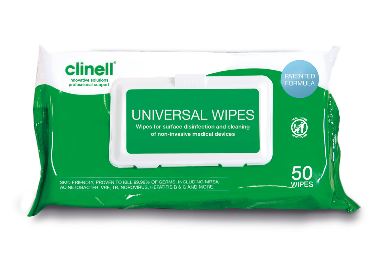 The resealable packaging keeps the 50 wipes moist and effective between uses, helping reduce waste and maintain consistent disinfection.